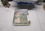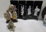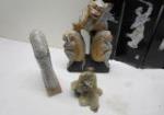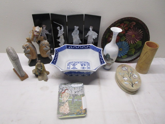 Wood carved monkey see no evil, hear no evil speak no evil figure with stone carved display, gem inlay on Stone jewelry box with other beautiful display items. Beautiful blue and white rectangle Bowl, wood carved and painted dish with a small lacquered divider screen for tabletop display, very delicate porcelain hand-painted vase and a bamboo shoot carved pencil holder made in jamaica. Beautiful pieces in overall very good condition, please preview.