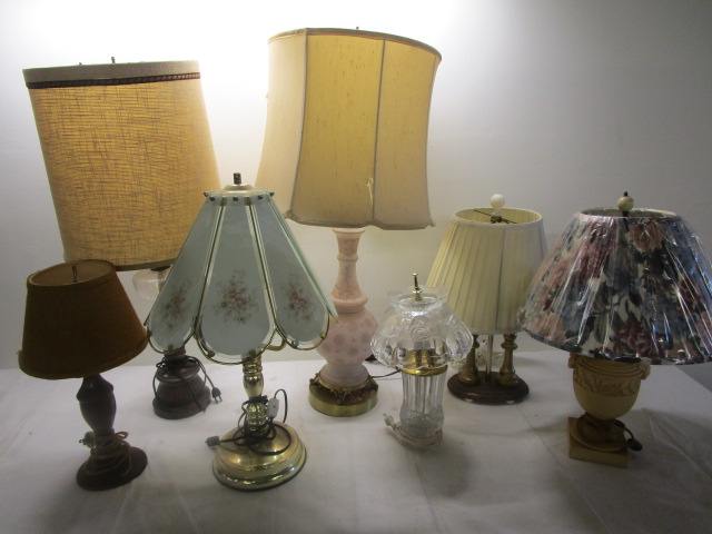 Glass and metal table lamp collection. 7 in all. Good condition, varying sizes. Please preview.