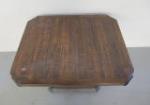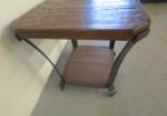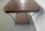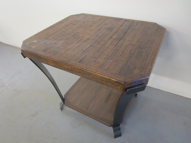 The District solid birch end table with a cast metal base and a copper finish. Solid table and heavyweight. Measures approximately 24 in tall by 23 in wide by 27 in deep. Table is in very good previously owned condition, please preview.