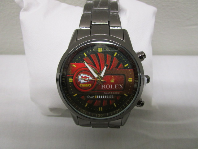 #1 Collectible new Kansas City Chiefs themed novelty watch featuring the team logo, a stainless steel case and a matching bracelet. This watch also has the Rolex crown logo, however Rolex does not officially partner with the NFL.