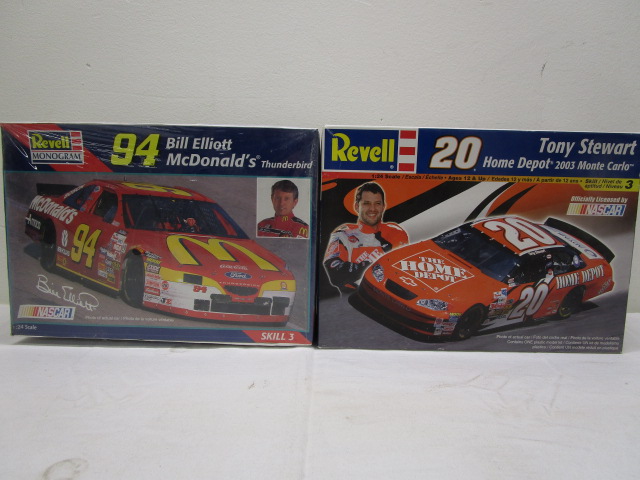 This pair of Revell / Monogram brand 1:24 scale model car kits includes a 94 Bill Elliot McDonald's Thunderbird (model # 85-2486) and a 20 Tony Stewart Home Depot 2003 Monte Carlo (model # 85-2196). The Bill Elliot McDonald's car is in new condition in its sealed box. The Tony Stewart Home Depot car is in previously owned condition in its opened box. Please preview.