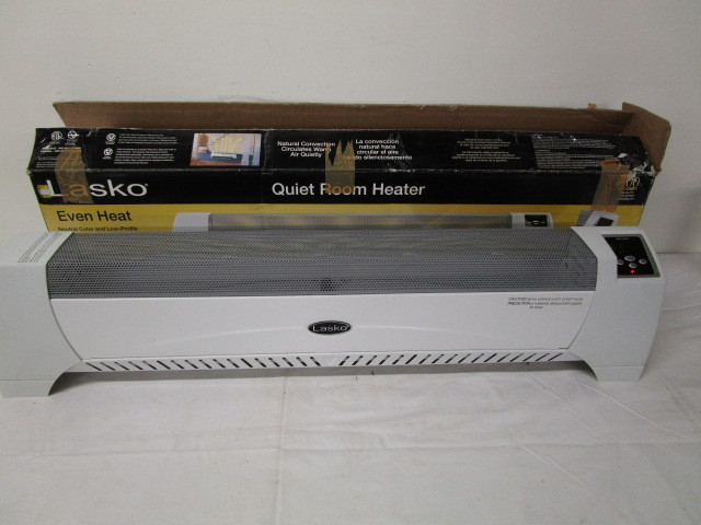 Lasko quiet room heater, 120 volt, in white. Features a digital display with thermostat and timer, built-in safety features and provides 1500 watts of comforting warmth. Previously owned, comes with original box. Please preview.