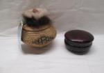 Beautiful and unique 5" handwoven grass basket with carved bone, recycled glass and bone beads. It is adorned with mink and beaver fur. Also included is an Italian Alabaster trinket dish.