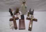 Collection of religious figures and crosses. Includes a mother of pearl sick call crucifix, a wooden wall crucifix, a 1916 New Testament, a chalk ware Infant of Prague with some damage, rosary beads and more.