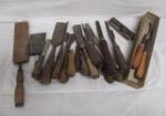 Collection of 20 vintage woodworking chisels for carving and carpentry.