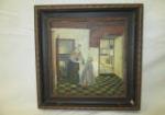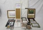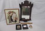 Assortment of wall decor including a 22" X 11" vintage Chippendale style mirror with a dark wood frame, a pair of 4-1/2" X 5" antique frames featuring a Victorian image on convex glass and a print, an 11-1/2" X 14-1/2" Norman Rockwell print. Also included is a vintage Oxbow Puzzle base.