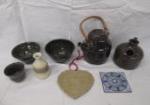 Darling assortment of stoneware pieces including a teapot with a bamboo handle, an antique stoneware jug. This type of jug is sometimes referred to as a "beehive" jug., small stoneware bowls and more.
