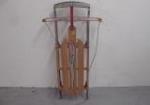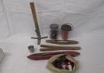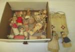 Interesting assortment of miscellaneous sewing/knitting items including buttons, a wood hand knitting doll, two vintage weaving shuttles, a "Pin-it" skirt marker and more.