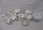 Partial set (30+ pieces) of an unmarked, hand painted, floral porcelain tea set. Pieces include a tea pot, thirteen saucers, eleven cups, a creamer, two serving plates and a covered sugar bowl.