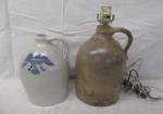 Pair of antique milk cans including a large 23-1/2" farmhouse dairy metal milk can with lid and a smaller 5 gallon milk can.