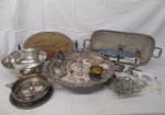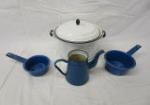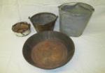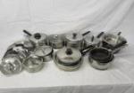 Assortment of cookware including a Wear-ever covered spaghetti pan, two small sauce pots, six mixing bowls, and six fry pans. These items are in (very) used condition. Please preview.