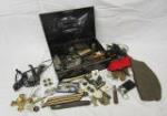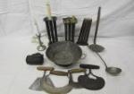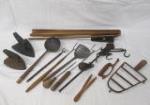 Large assortment of tools utilized for metallurgy. These tools include files, hammers, a metallurgist apron, cast iron dippers and more.