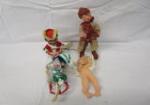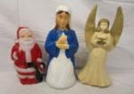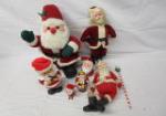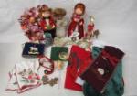 Christmas box lot with two vintage carolers, a fabric wreath, Christmas stockings and more.
