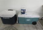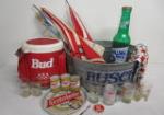 Let the party begin! Collection of alcohol related items including four advertising umbrellas (Martini and Ross, Budweiser, Midori and plain blue and white) a large galvanized Busch bucket, a Bud cooler, eight beer (brand labeled) beer glasses, a 23" Rolling Rock plastic, advertisement, bottle and a vintage beer tray.