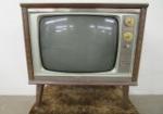 Vintage mid-century Zenith console television set featuring a wood-grain cabinet and side dials.