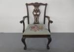 Gorgeous, antique mahogany Chippendale style arm chair featuring a beautiful needlepoint seat, cabriole legs, and distinctive ball-and-claw feet.