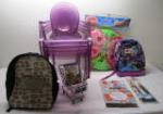 Nice selection of children's items including four purple polycarbonate Philippe Starck Lou Ghost Children's style chairs, a standing Pusheen character backpack, a new Melissa and Doug Sunny Patch Bella Butterfly tunnel, a Sketchers Galaxy backpack, a new Mermaid coloring book and a package of new paint brushes.