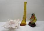 Wood carved monkey see no evil, hear no evil speak no evil figure with stone carved display, gem inlay on Stone jewelry box with other beautiful display items.