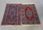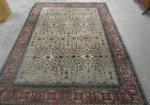 Lovely burgundy, blue and cream color Persian style rug with fringe.