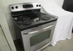 GE black and stainless oven (model # JBP35SM1SS) with coil burners and touch controls.