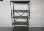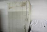Vintage white, wooden farmhouse style primitive wooden Jelly cabinet with a large door and six shelves.