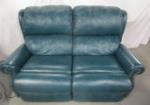 Gorgeous soft, mint condition dark teal (with brass accents) leather motorized (2) recliner love seat. This item matches the chair recliner in lot #4.