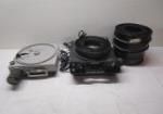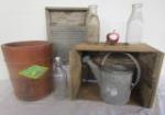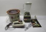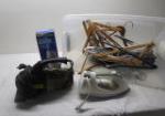 Royal Dirt Devil Hand Vacuum, Clothes Iron, Humidifier and Bin of hangers.