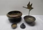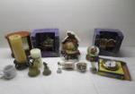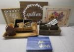 Porcelain, Stone and slate dog figurines, trinket box, ashtray and hanging welcome slate sign.