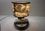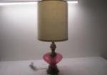 Vintage tall cranberry glass and brass table lamp with original shade.