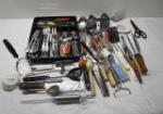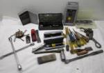Assorted tools with a lug wrench, hand tools, planar and socket sets.