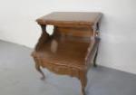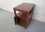 Recliner side table with open front, sliding drawer and magazine rack on back.