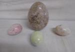 | Stunning collection of four polished decorative egg stones (one made from fossilized stone). The three smaller eggs are marble, the three color hues (yellow, pink, green) make them unique. The larger egg measures 6", the smaller stones measure 3". |