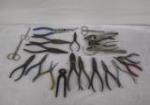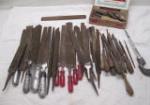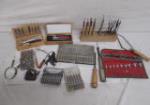 | Collection of vintage wood burning/carving tools including vintage gouges, chisels, craft knives, a vintage "helping hands" tool (used in electronics, crafting, and hobbies to hold small objects in place under a magnifying glass) and more. |
