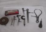 | Collection of vintage machinist's tools including a Starrett brand, vintage, measuring tape, a vintage, Starrett brand vintage center punch, a micrometer and more. |