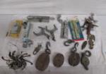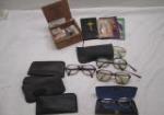 | Collection of vintage eyeglasses, eyeglass tools and religious momentos. |