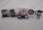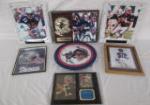 | Assortment of Drew Bledsoe memorabilia featuring an 11" clock, a Kenneth Gatewood print of a Drew Bledsoe as a youngster, a "Collector's Showcase" featuring a photo of Bledsoe, a players card and a plaque on a marble style wooden base, and three additional Bledsoe plaques with photos and name plates. |
