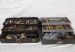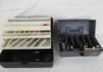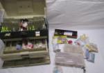 | Box tray of fishing lures and other fishing supplies. |