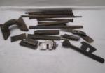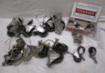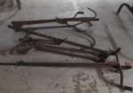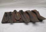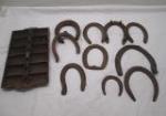 | Cast iron mini loaf pan and assorted vintage horseshoes. |