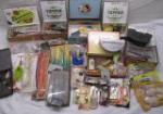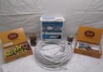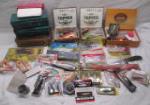 | Large (box full) collection of fishing items including new fishing lures, Hydrotail 6" swimming worms, three tackle boxes of various soft plastic fishing lures, jig heads, hooks, weights, and more. |