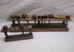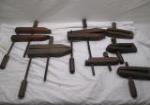 | Assortment of various antique/vintage tools and hardware including wooden pulleys, hooks, clamps, oar hooks, coat hooks and more. |