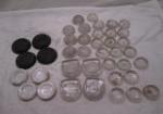 | Lot of 40 glass furniture coasters. some black, some white, and the rest are clear. |