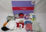 | Collection of adorable American Girl products including a Cozy Christmas Scene backdrop, American Girl clothing and accessories (including a purse, shoes and bouquet of flowers) and more. |