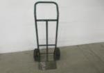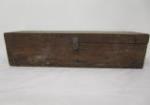 | Vintage wooden tool box with large metal handles. |