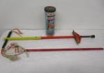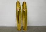| Interesting pair of “Snurfer Board” mono ski type snow boards. These item were designed to be controlled by the attached rope. This design does not use bindings but has metal tracks for traction. These items measure 7“W X 48“L. |