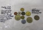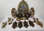 | Assortment of vintage and mid-century faux metal and wooden home decor items including wooden musical notes, four matching crest style wall decor pieces, a pair of Copper Craft style ship plaques, a large gold toned mirror and more. |