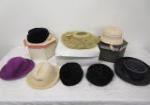 | Variety of six vintage hats with hat boxes. The hats include a silver fur pillbox hat, a woven straw-like hat, a woman's bowler style hat and more. |