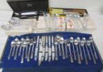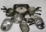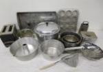 | Adorable vintage child's metal kitchen cabinet with play cookware, utensils and tea set. |