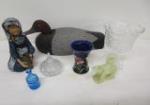 | Trio of home decor items including a 15" hand carved bust of an African woman, a 15" Kosta Boda style art glass plate and a 17-1/2" hand painted "Three Hands" decorative plate. |