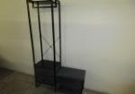 | Tall industrial style free standing hall tree featuring a hanging rod, two drawers and a cloth bench with additional storage. |