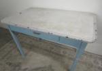 | Vintage enamel-top kitchen table featuring a white surface, light teal wooden base and one drawer. |